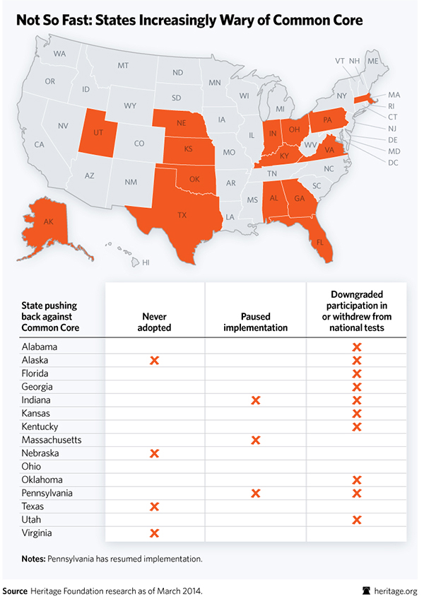 Seit dem Mandat ,,No Child Left Behind”, das 2001 von George W. Bush erlassen wurde, müssen alle 50 US-Bundesstaaten ihre Schüler jährlich prüfen, um sicher zu sein, dass jedes Kind das Material vollständig versteht. Dazu musste jeder Bundesstaat seine eigenen Standards entwickeln, damit Schulen wissen, welcher Lernstoff in den Prüfungen erscheint. Schulen bekommen nur Geld von der Bundesregierung, wenn die Testergebnisse sich jedes Jahr verbessern. ,,Dieses Programm führt zu oberflächlichem Unterricht in dem die Kinder sich nur für die Prüfung das Material gemerkt haben, ohne es wirklich im Griff zu haben”, meint eine Mutter drei Kinder im US-Bundesstaat Virginia. Weiterhin halfen die niedrigen Standards den Bundestaaten die Tests zu bestehen und finanzielle Hilfe vom Staat zu bekommen.