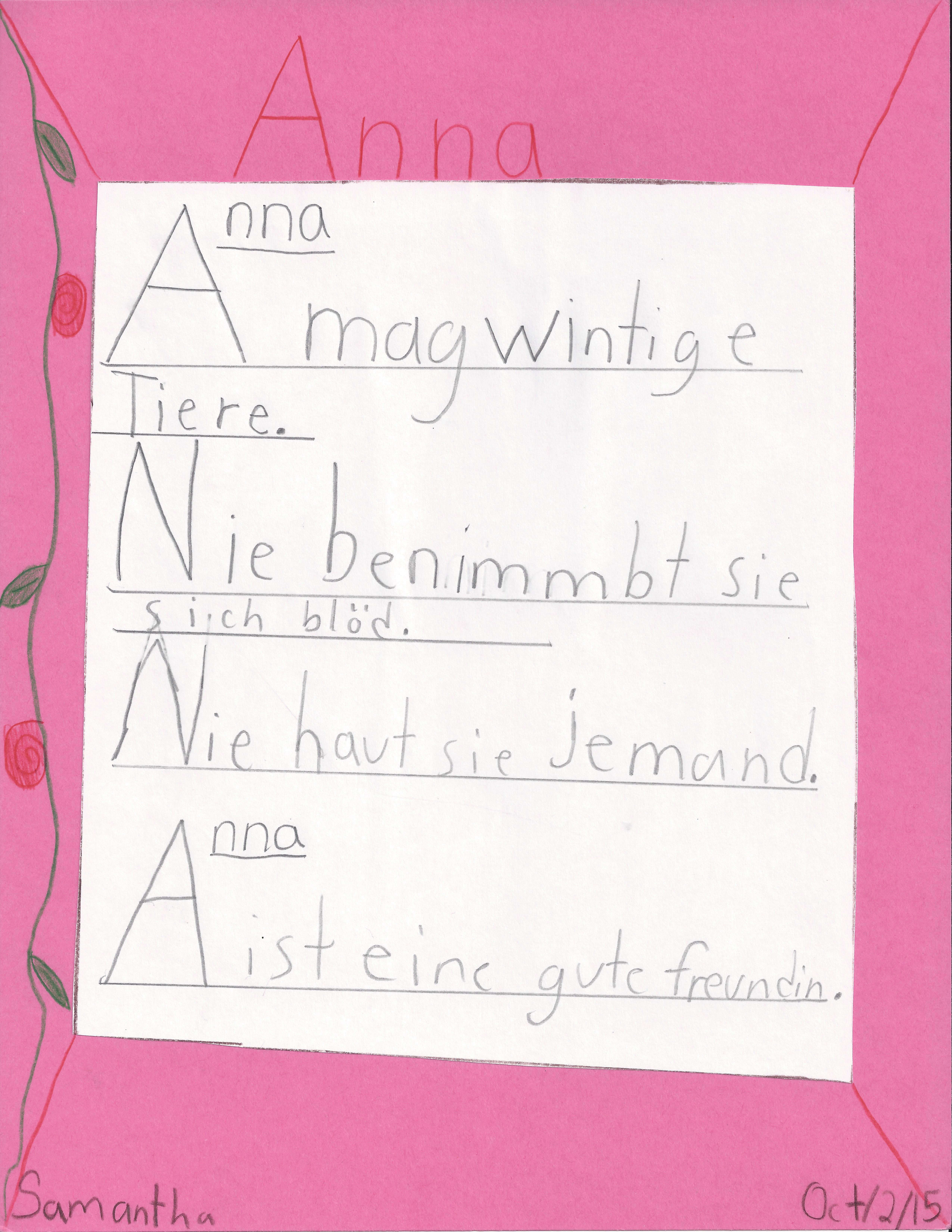 Ein Akrostichon ist eine besondere Art von Wortspiel: Es ist ein Gedicht, bei dem die Anfangsbuchstaben der Zeilen nach unten gelesen ein Wort ergeben. Die Schülerinnen und Schüler der Klasse B3 von Ingrid Genzel haben aus den Namen ihrer Klassenkameraden und -kameradinnen Achrostichen gemacht – und die besten für WORTSPIEL ausgesucht.
