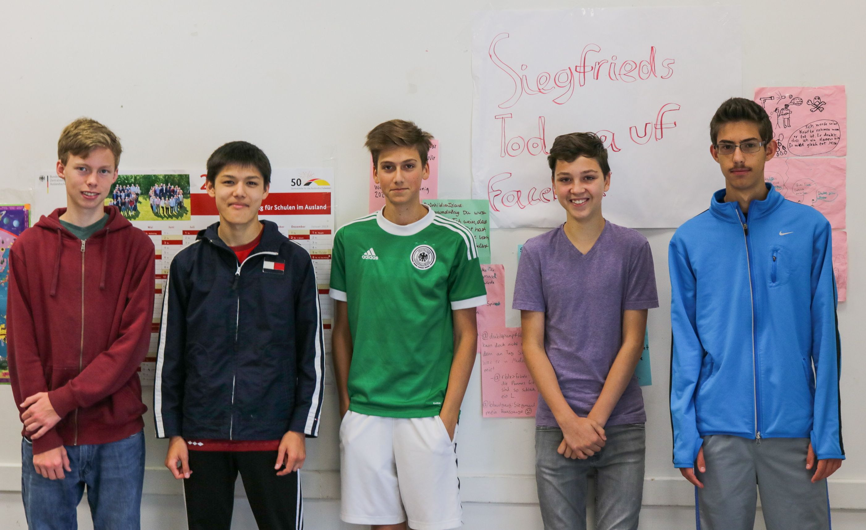 Die DSD1 Klasse hat einige Höhepunkte des Nibelungenliedes kreativ dargestellt. Die erste Gruppe hat Siegfrieds Tod als Berichterstattung auf Tagesschau aufgeführt. Eine Reportage am Tatort, wo Siegfrieds Leiche gefunden wurde, war auch dabei. Killian erzählte, dass Yuxi die Idee hatte, eine Tagesschau-Sendung zu machen, weil sie oft zu Hause Tagesschau anschaut.