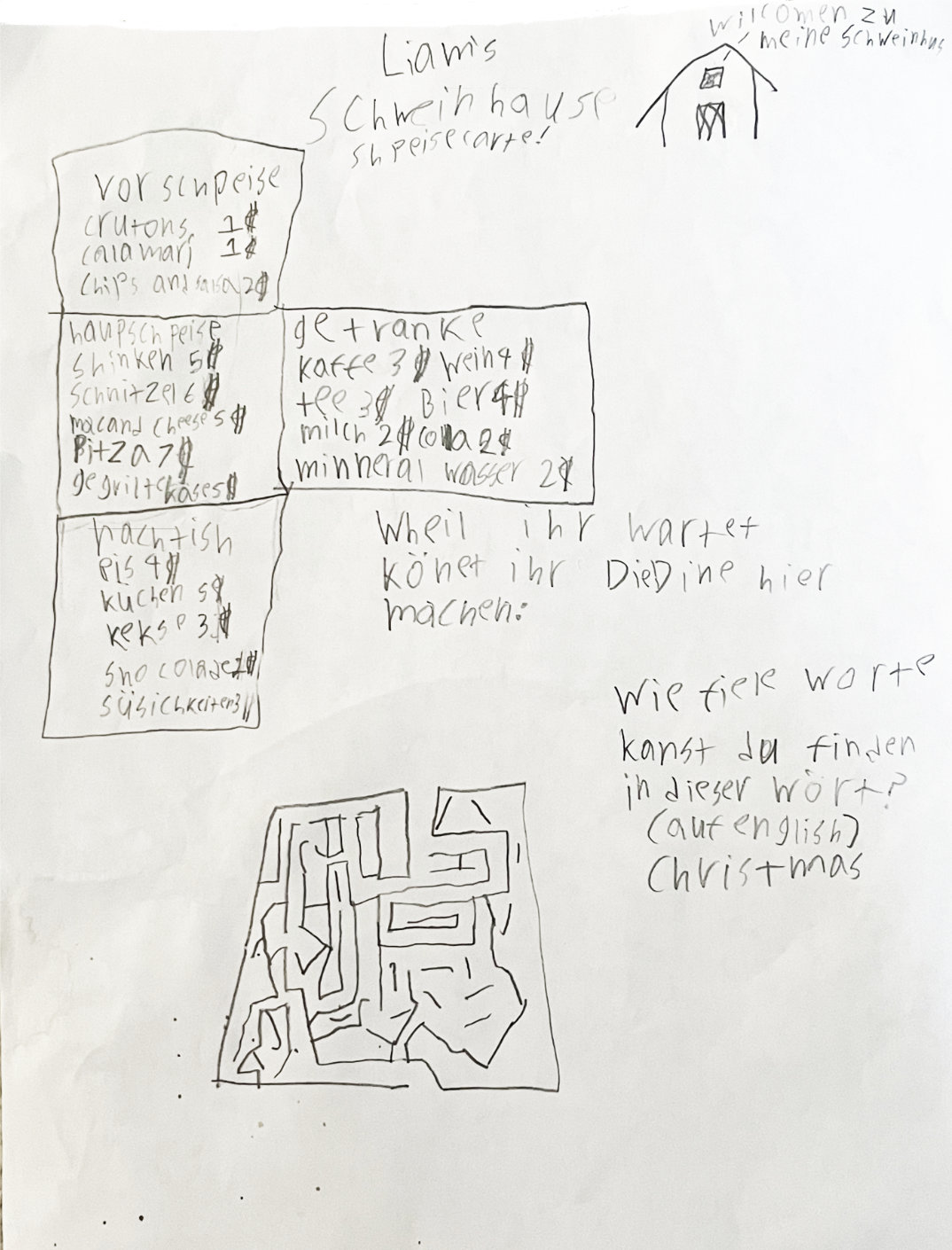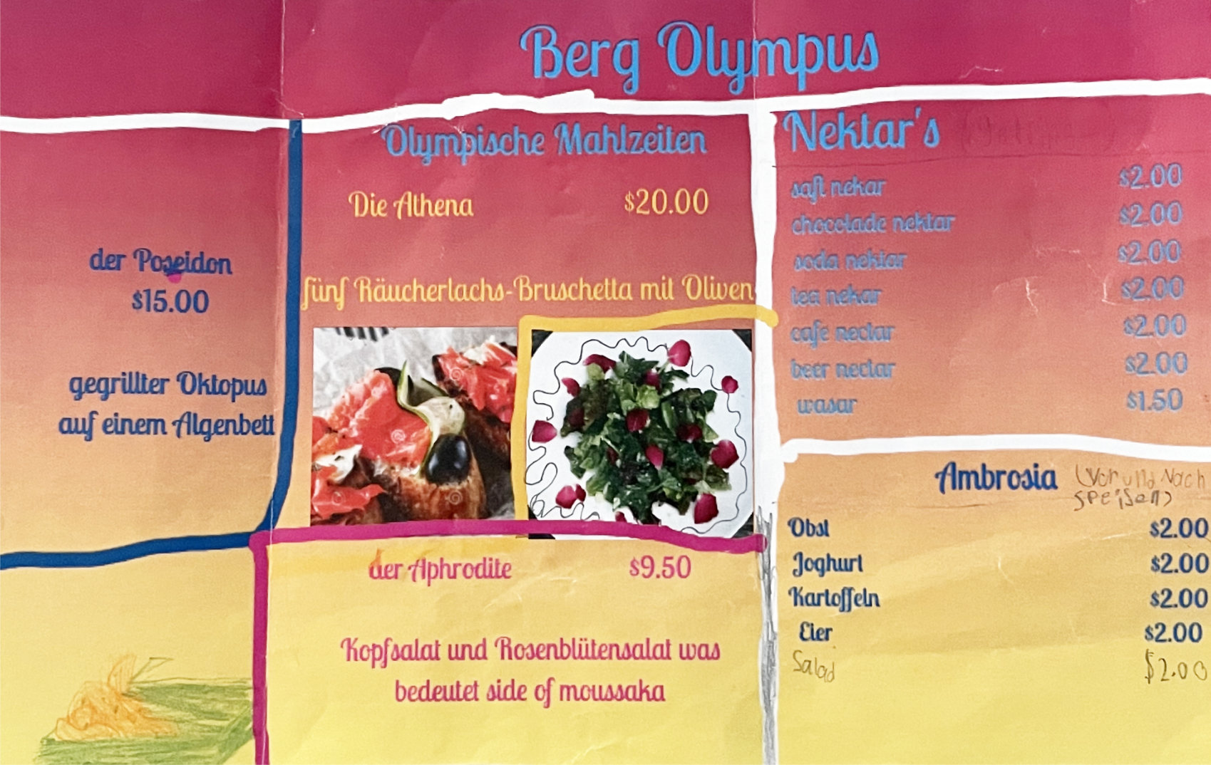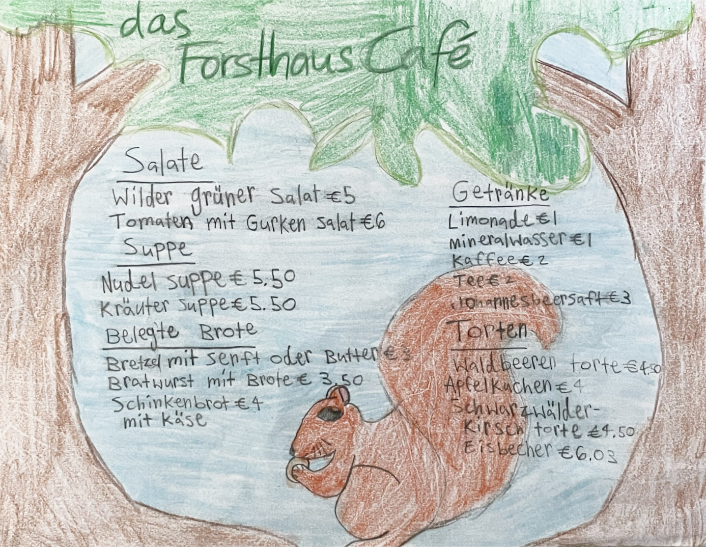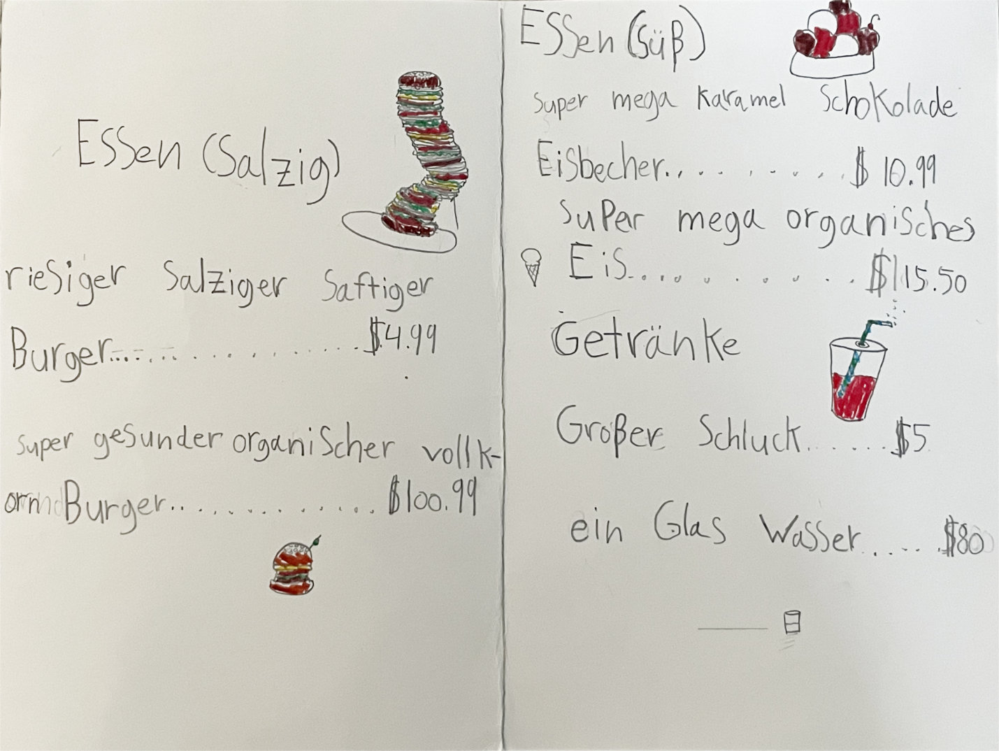 Wie würdest Du Dir Dein eigenes Restaurant vorstellen? Was gäbe es dort zu essen und zu trinken? Die Klasse 4 mit Deutsch als Zweitsprache hat sich mit dieser Frage unter dem Thema „Mein Traumrestaurant“ beschäftigt. Sie sollten eine Speisekarte für ein eigenes Restaurant erstellen. Und jedes Restaurant sollte einen Namen und ein Thema haben. Es sollten auch Preise auf der Speisekarte stehen, damit die anderen Schülerinnen und Schüler das Essen „bestellen“ konnten.