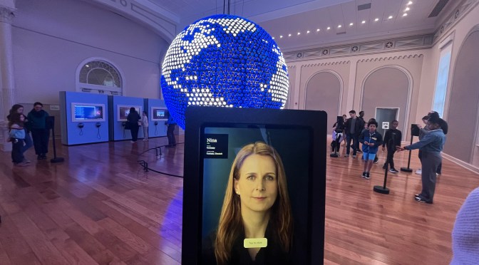 Im Zimmer mit der großen Weltkugel des Planet Word Museums erzählen Muttersprachler auf vielen kleinen Bildschirmen die Besonderheiten ihrer Muttersprache. Dort erzählt eine deutsche Frau die Besonderheiten der deutschen Sprache.