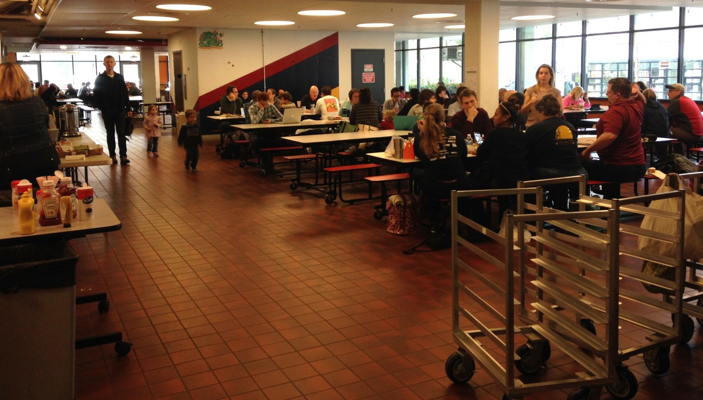 Die Cafeteria ist das Zentrum der Sprachschule am Samstag. Hier gibt es viel zu essen und genügend Tische für die Eltern, um zu arbeiten und sich zu unterhalten. Foto: Phillip Reeves