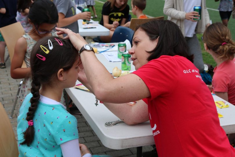 Eine GLC-Lehrerin malt Diamanten auf die Stirn eines der Kinder. Mit vielen verschiedenen Farben und Pinseln kann man vieles malen. Wie die langen Schlangen zeigen, lieben Kinder diese Malerei. Foto: Emma Lenz-Mann
