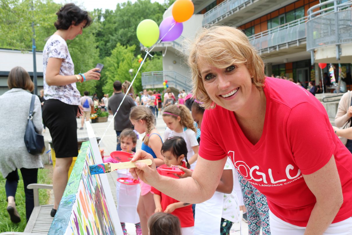 Schulleiterin Frau Hopkins malt mit Kindern an einem schönen Bild der Bilderserie für die Vierzig-Jahr Feier der GLC. Foto: Emma Lenz-Mann