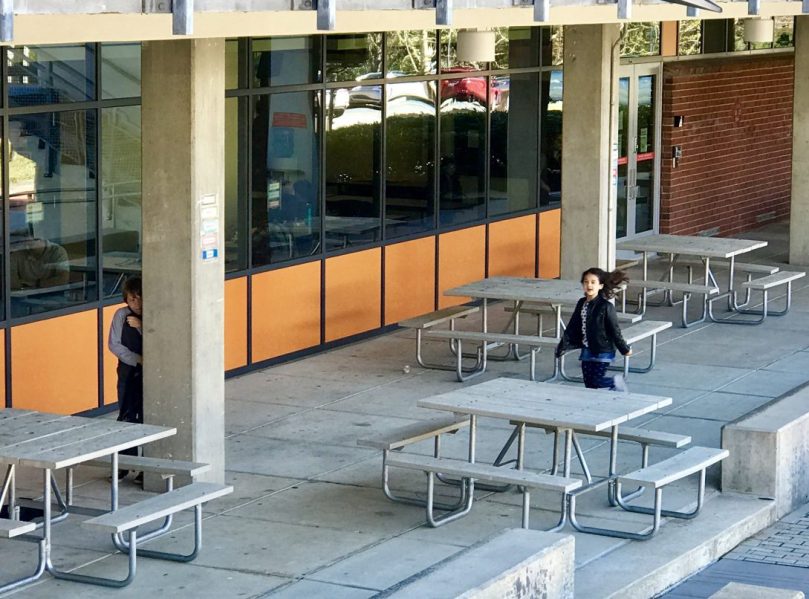 Die Stützbalken der Balkons des Hauptgebäudes sind für die kleinen Schüler auch ein guter Platz, um sich zu verstecken. Das Versteckspiel ist eines der Lieblingsspiele der Kinder. Foto: Nicholas Polansky