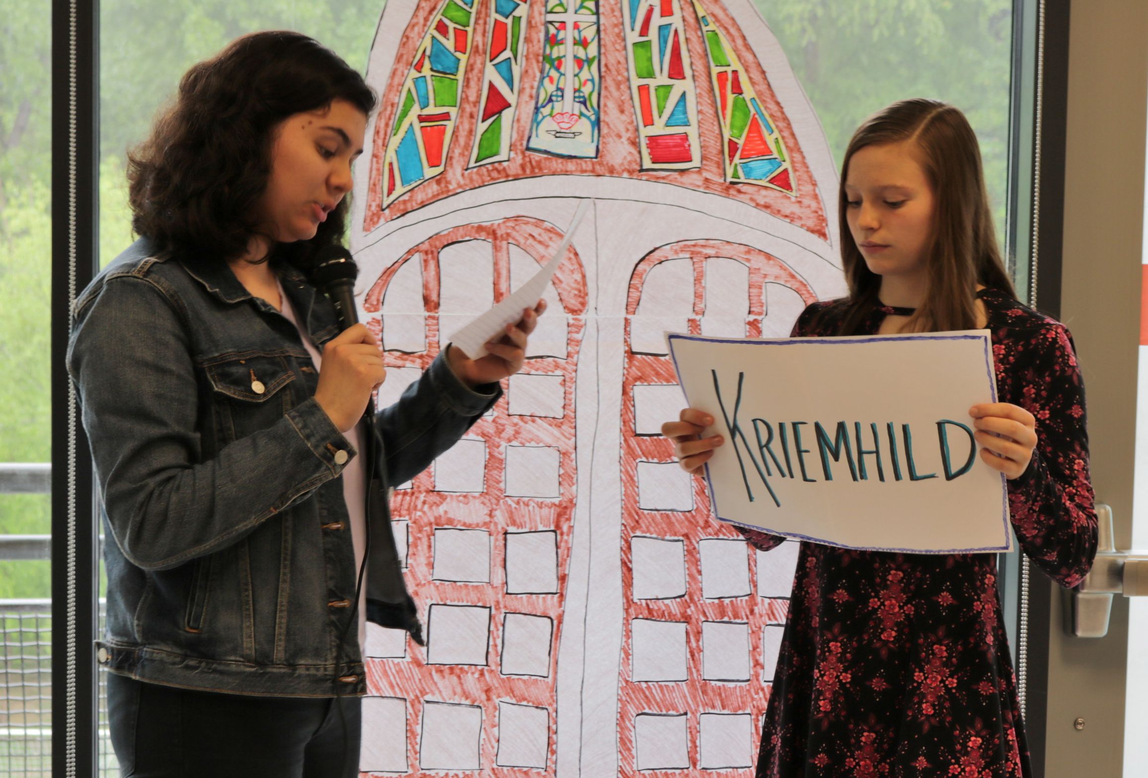 Giselle S. (16) spielt Reporterin und Nadia L. (14) spielt Brunhild und Kriemhild. Giselle sagte: „Und jetzt bin ich hier mit Kriemhild. Sagen Sie mir, was ist ihre Meinung?“ Nadia antwortete: „Brunhild hat gesagt, dass Siegfried ein Dienstmann ist! Aber das stimmt nicht! Er ist ein mächtiger König.“ Foto: Joel Lev-Tov