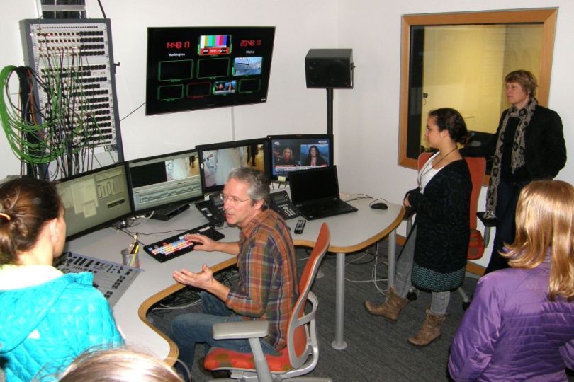 Im ZDF Regieraum mit Techniker/Cutter Askan Buse (sitzend) und Senior Producerin Annette Brieger (stehend, rechts)