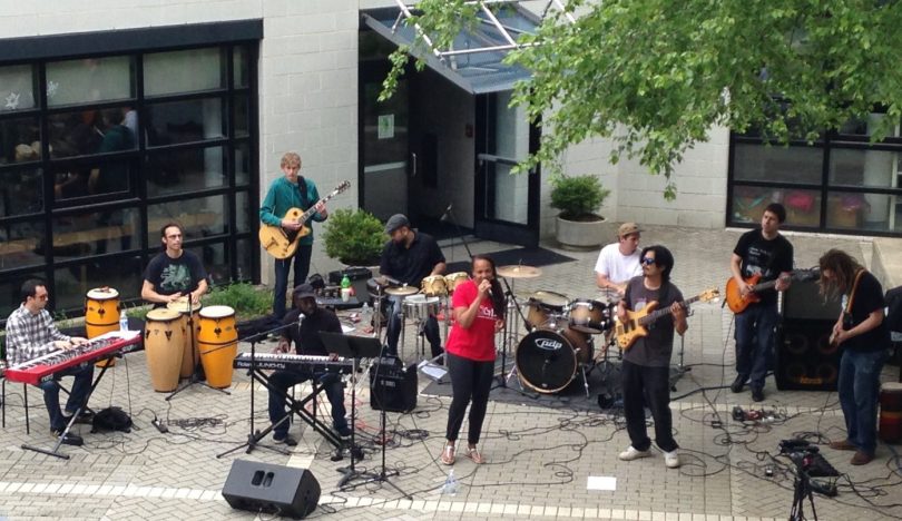 Die Shamans of Sound Band aus Maryland spielte als Debütvortrag während des Festes Reggae und Neo-Soul Musik. Sängerin Navisa Yasmin Hunter ist Lehrerin an der GLC und der Gitarren- und Posaunenspieler Timmy McGowan, der nur heute dabei war, ist in der GLC DSDI Klasse. Foto: Phillip Reeves
