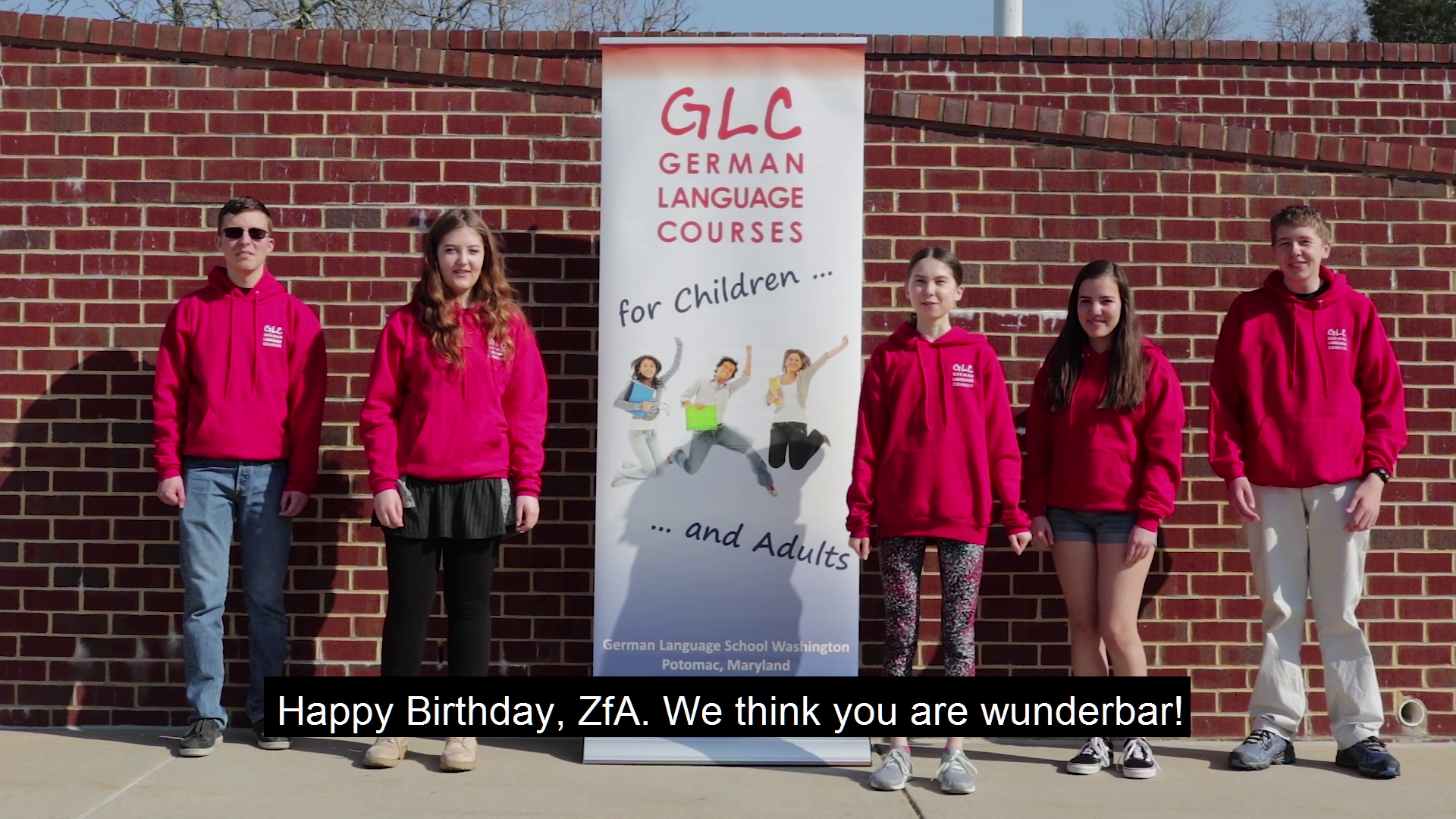 Die Deutsche Sprachschule Washington gratuliert der ZfA (Zentralstelle für das Auslandsschulwesen) zum 50. Geburtstag. (v.l.n.r. der Media Kurs: Alex Meinze, Anna-Lena Wörmer, Eva Gubitz-Hess, Yesenia Montenegro, Lev-Tov – sie haben das Video produziert)
