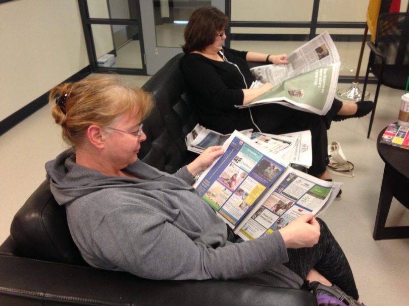 Viele Eltern, wie hier Marion Lange, suchen sich in der großen Schule einen komfortablen Platz aus und vertiefen sich in eine Zeitung, bis die Kinder fertig sind mit dem Unterricht. Foto: Phillip Reeves